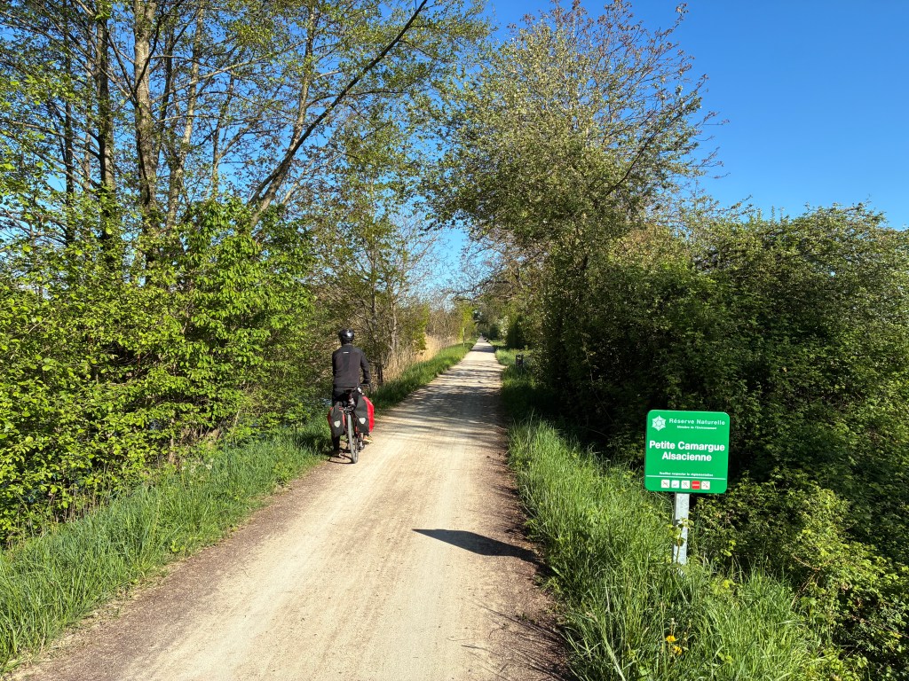 Die Route zweigt bald vom Rhein ab und es geht in der Folge längere Zeit einem Kanal entlang, der uns durch ein Naturschutzgebiet führt, das sich «Petite Camarque Alsacienne» nennt.