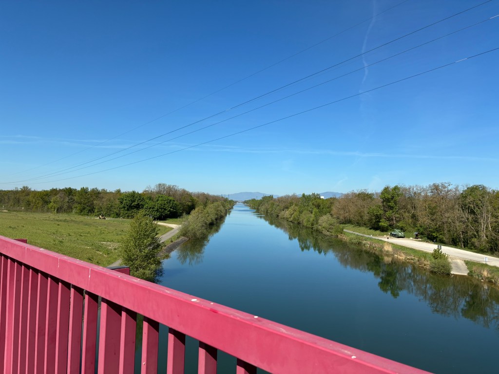 Kurz vor Mulhouse verlassen wir den Kanal, indem wir eine Brücke überqueren, von der man eine tolle Aussicht bis in die Vogesen hat.