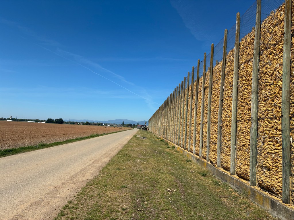 Nach ein paar Kilometern durch Waldlandschaften gelangen wir in offeneres Gelände, wo uns eine ca. 200 m lange, etwa 4 m hohe und ca. 80 cm breite «Mauer» etwas stutzig macht. Sie besteht nämlich komplett aus Maiskolben. So etwas haben wir noch nie gesehen und wir fragen uns nach dem Sinn und Zweck dieser «Maiskolbenmauer». Vielleicht gibt es unter der Leserschaft Leute, die sich daraus einen Reim machen können. (?)