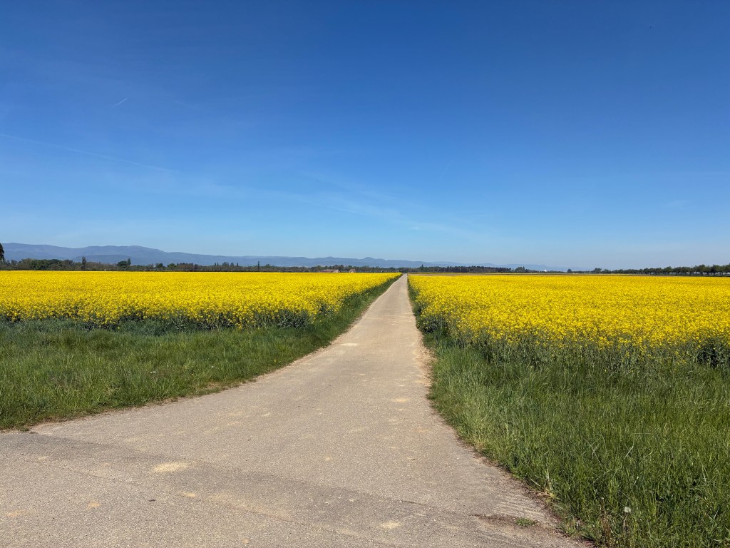 Die Landschaft in diesem Abschnitt ist nun geprägt durch weite Felder, die zum Teil für die Aussaat bereit sind oder wie im folgenden Bild in voller Blüte stehen.