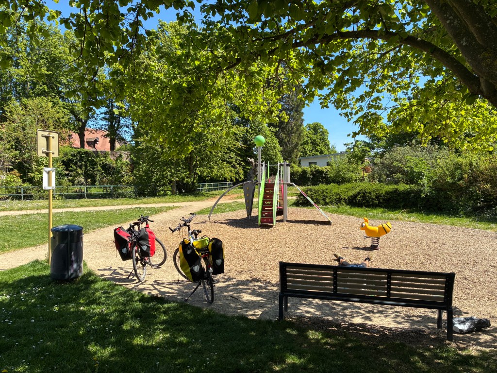 Bisher haben wir kaum eine Pause gemacht, weshalb wir ca. um 12 Uhr und nach rund 50 km bei einem schönen Plätzchen mit Sitzbänken im Halbschatten anhalten und unsere Käse- und Salamibrote essen.