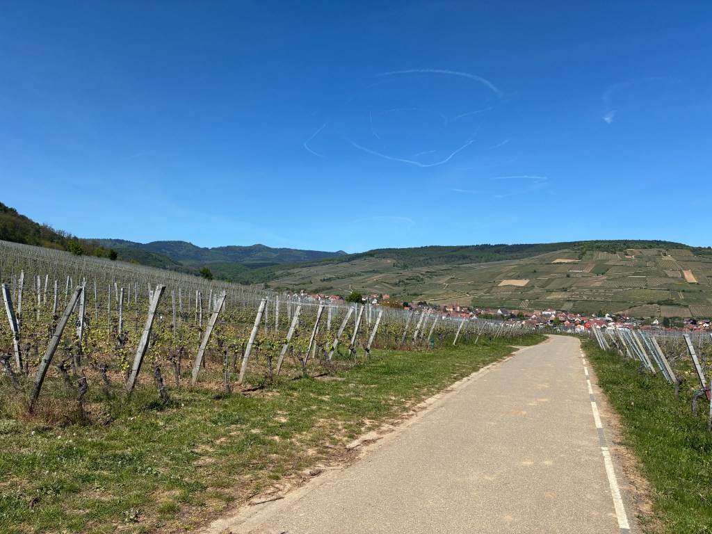Wir befinden uns nun auf der Veloroute des Vignobles, also auf der Weinberge-Veloroute, die uns ein wenig in und auf Hügel führt, auf der, soweit das Auge reicht, Weinreben kulitivert werden.