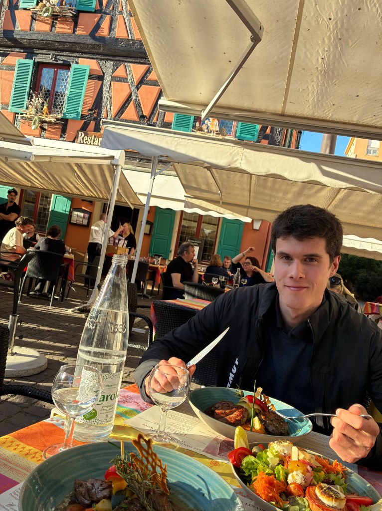 Nach der obligaten Dusche und kurzem Nickerchen brechen wir auf, um die sehr sehenswerte Innenstadt von Colmar zu besichten und natürlich auch unseren Hunger zu stillen. Schnell werden wir fündig und wir geniessen die letzten Sonnenstrahlen beim Abendessen im Restaurant Pfeffel.