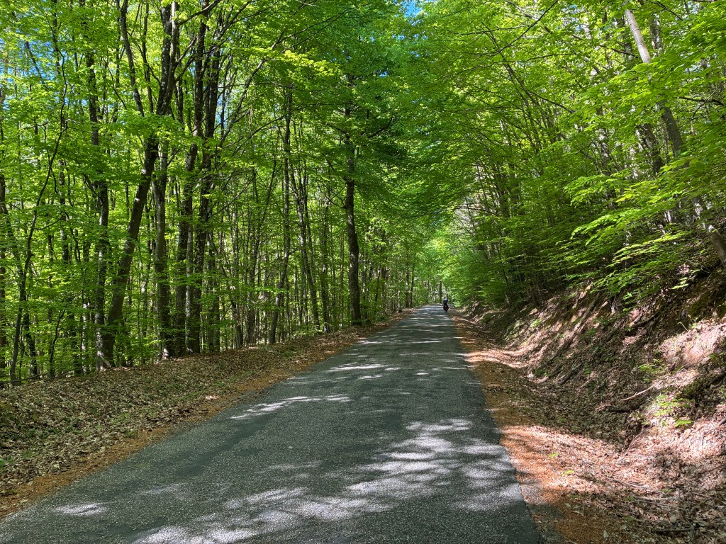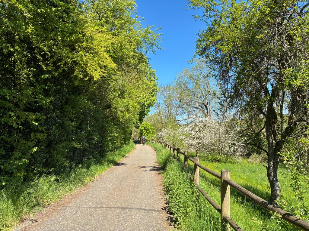 Wir fahren ohne Pause und gelangen auf kleineren Abfahrten in ein Tal, wo es einen schönen Fahrradweg hat.