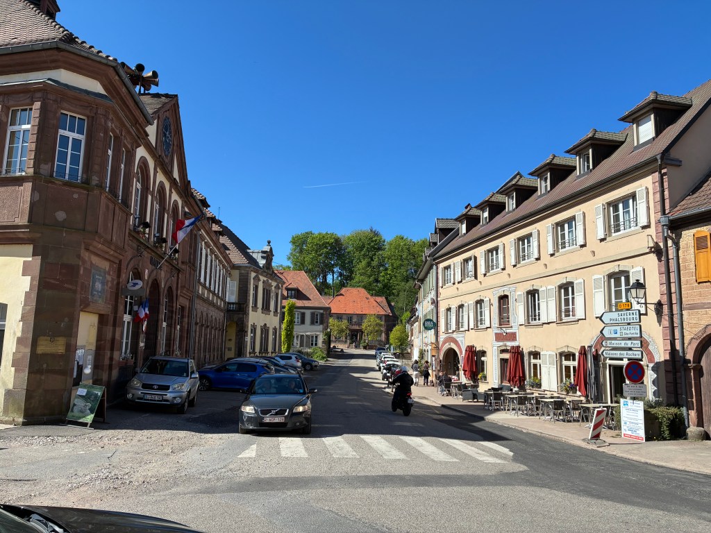 Der Aufstieg gestaltet sich weniger happig als erwartet und führt uns durch eine grüne und beruhigende Waldlandschaft. Als wir oben sind, staunen wir, dass wir hier ein kleines Städtchen vorfinden mit schönen Häusern. Es heisst La Petite-Pierre.