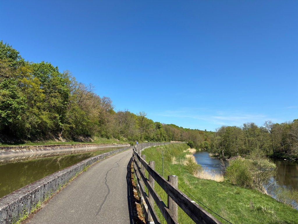Hier gelangen wir nun erstmals an die Sarre und dem zugehörigen Kanal, der sich «Canal des Houillères de la Sarre nennt. Offenbar wurde er früher benutzt, um die Steinkohle (la houille) von den Bergwerken in der Region abzutransportieren.