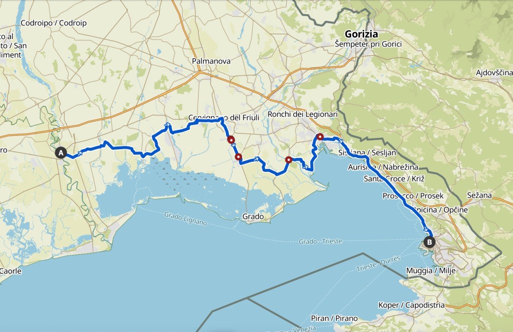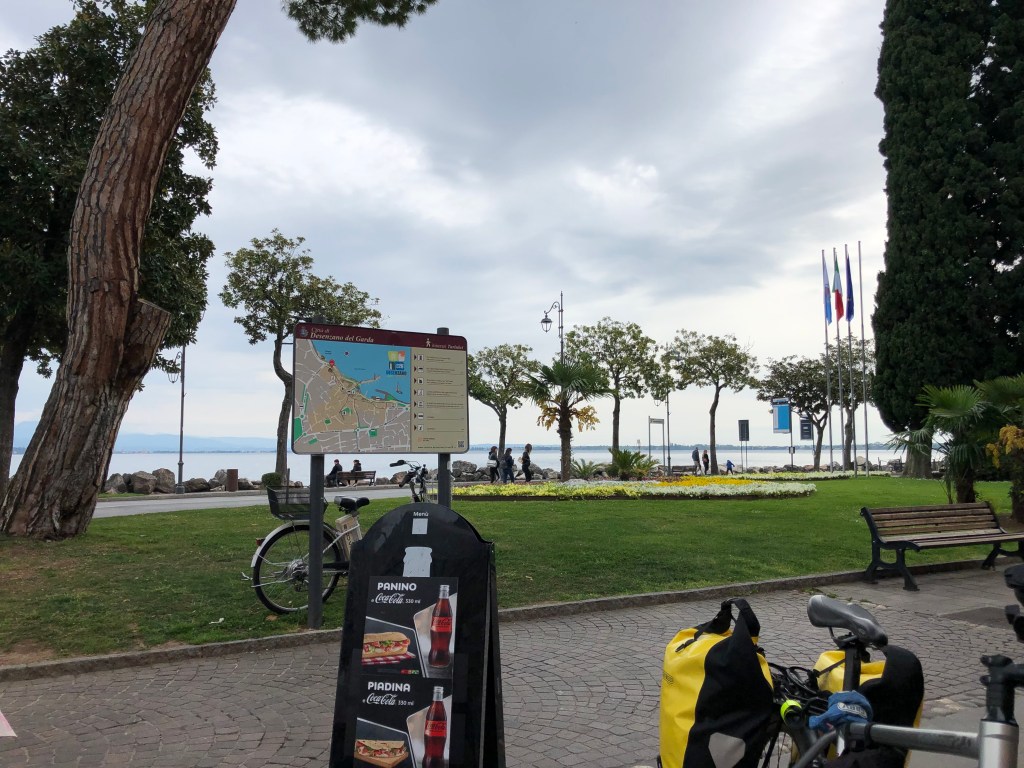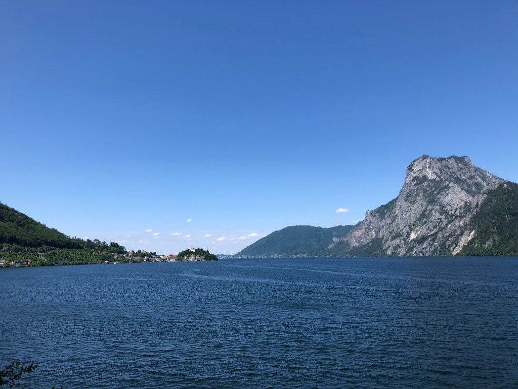 Nachdem ich in der Folge eine zeitlang auf einem Fahrradweg entlang einer stark befahrenen Strasse dem Fluss Traun entlanggefahren bin, erreiche ich den Traunsee, wo ich einen kurzen Halt mache.