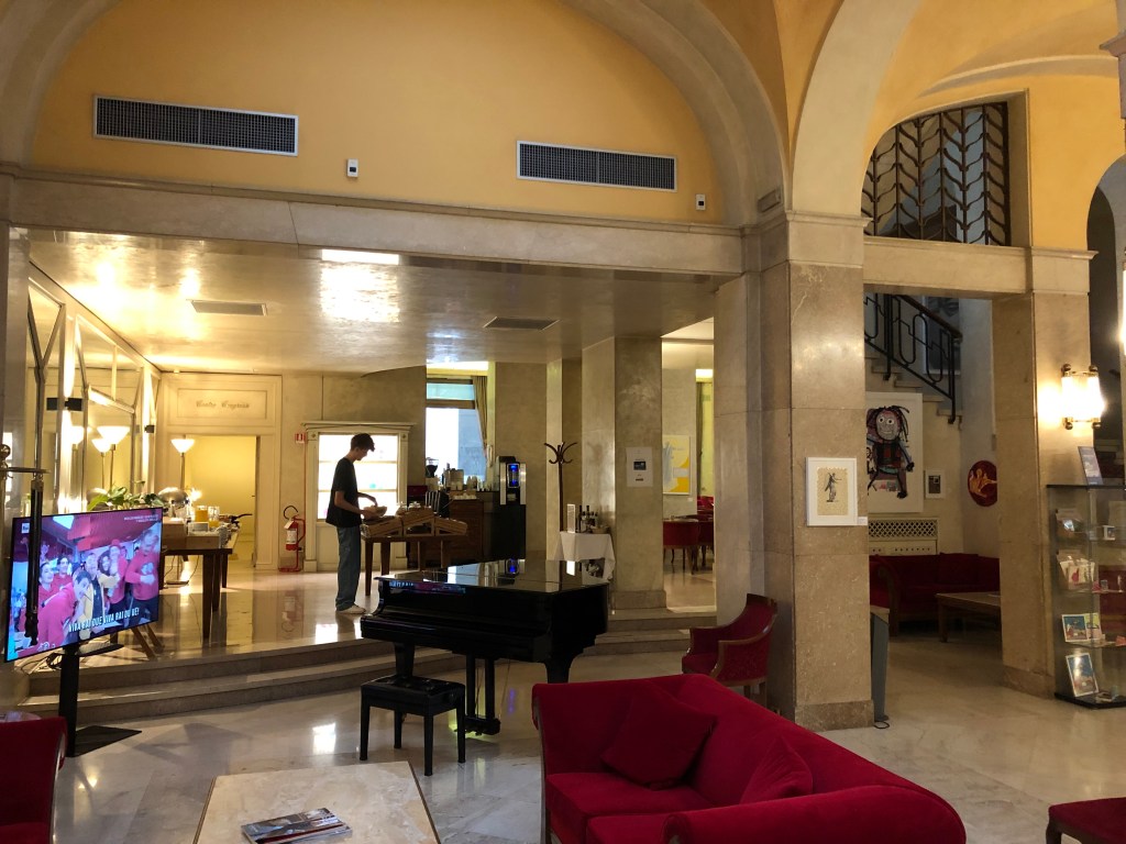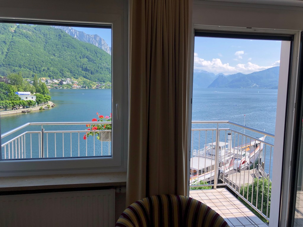 Das Hotel, in dem ich übernachten werde, liegt direkt am See und von meinem grossen Zimmer habe ich eine wunderbare Aussicht.