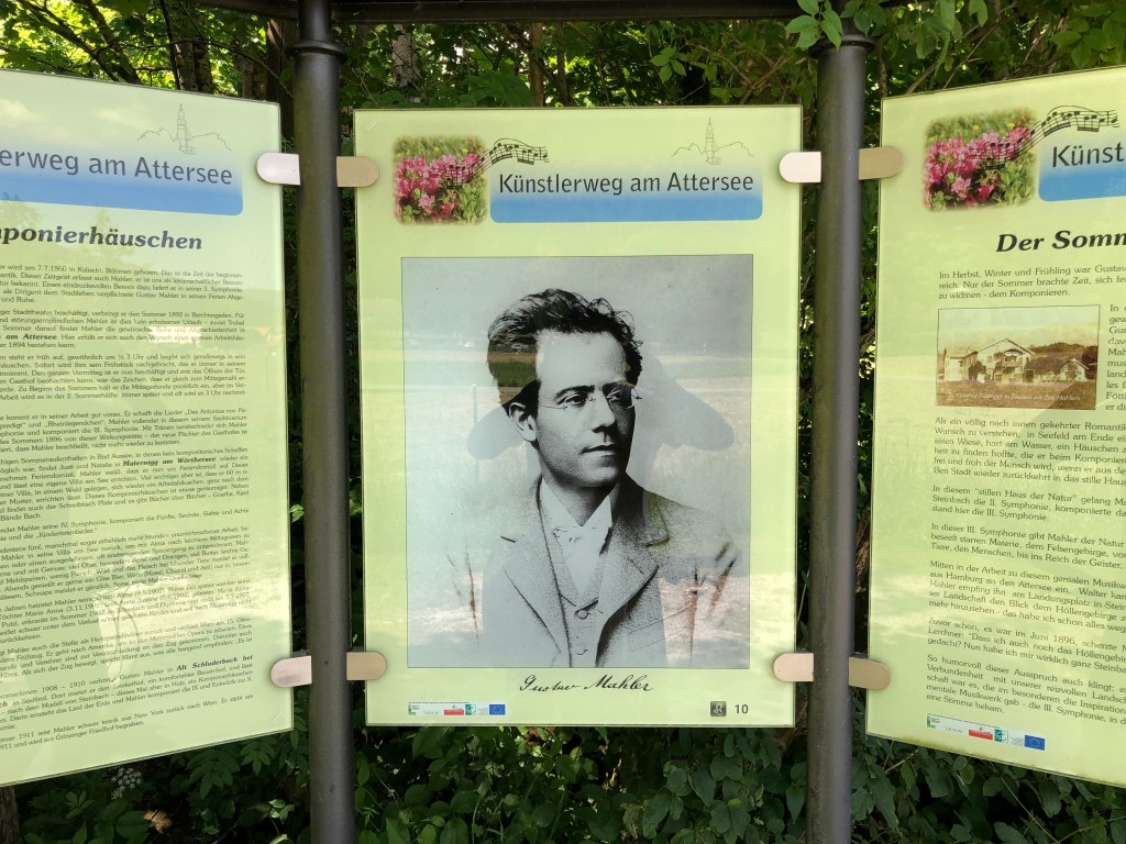 Bald biege ich rechts ab und komme ins Weissenbachtal. Zu Beginn gerate ich auf den sogenannten Künstlerweg und lese auf einer Schautafel, dass hier ein berühmter Komponist mehrmals den Sommer verbrachte und an seinen Sinfonien schrieb. Erkennt ihr ihn?