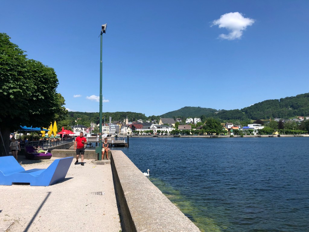 Da heute eine ziemliche kräftige Bise weht, habe ich meist kühlenden Fahrtwind. Das ist einerseits angenehm, andererseits aber auch ein bisschen mühsam, da es Gegenwind ist und ich so nicht schnell vorankomme. Das macht aber nichts, da die heutige Etappe nicht sehr lang ist. Ich fahre nun bis an mein Etappenziel Gmunden diesem schönen See entlang.