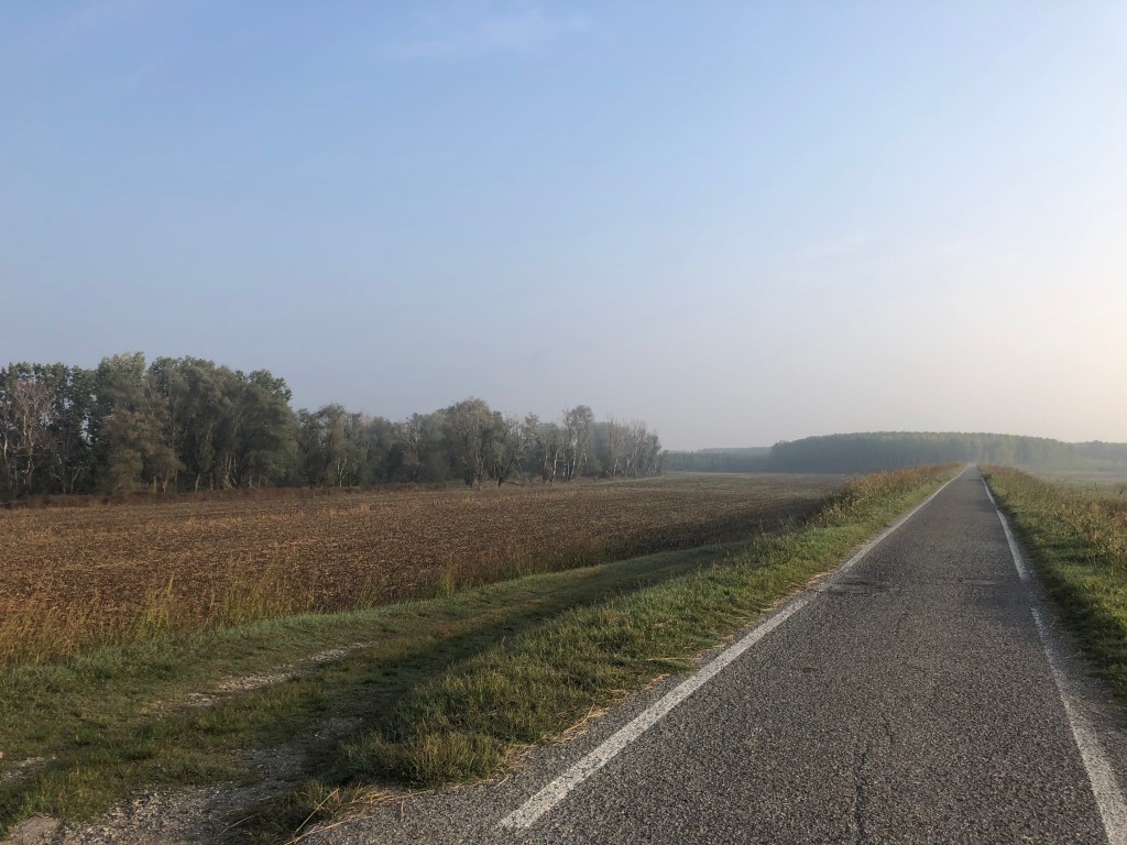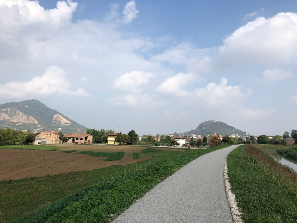 Ziemlich überrascht bin ich, als zu meiner Linken plötzlich Hügel auftauchen, das hatte ich gar nicht erwartet. Wie ich später herausfinde, sind es die sogenannten Euganeischen Hügel, die sich südwestlich von Padua aus der Po-Ebene erheben.