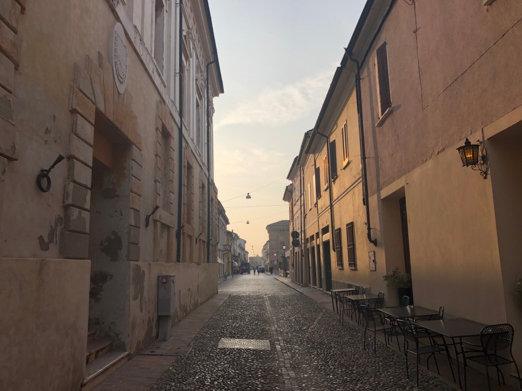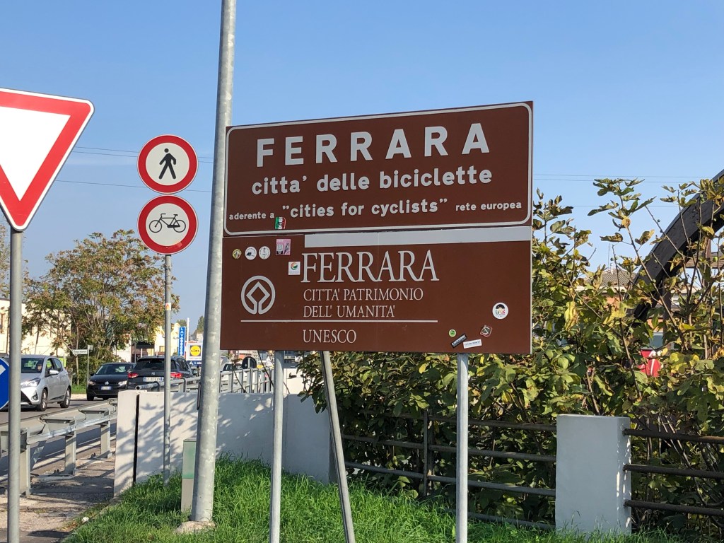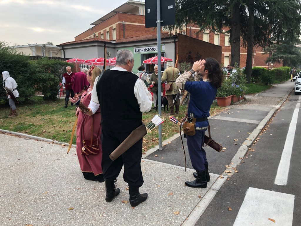 Ich staune, dass am heutigen Sonntagmorgen schon viel Betrieb ist in Ferrara. Unter anderem komme ich an einer Gruppe von Leuten vorbei, die sich in mittelalterliche- oder Renaissance-Montur geworfen haben und Pfeil und Bogen mit sich tragen.