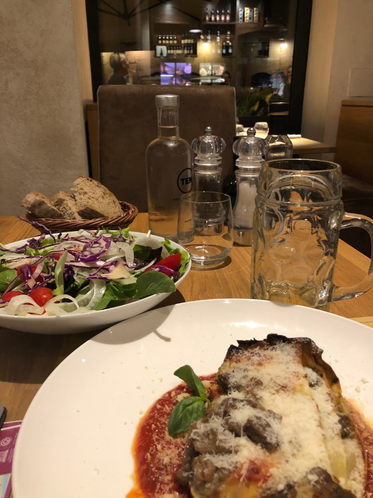 .Hier bestelle ich einen Salat und Spaghetti al pomodoro, Mittagessen und Nachtessen in einem.
